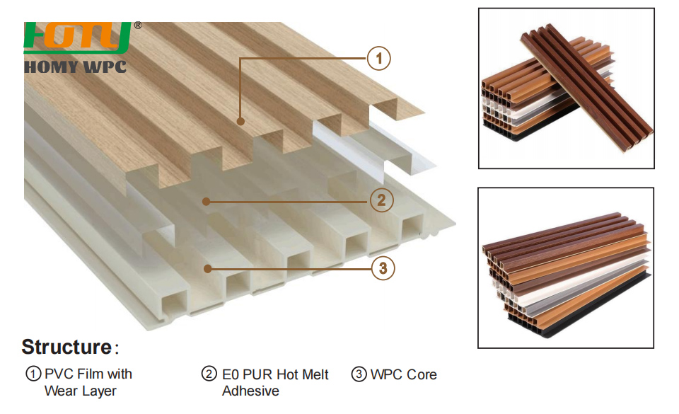Our WPC Wall Panel consists of PVC film with wear layer,E0 hot melt adhesive and WPC core.