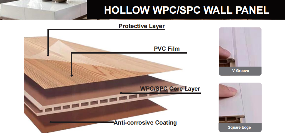 We not only have normal SPC wall panel, but also have the hollow ones, we call this type of wall panel as the hollow SPC wall panel, not only SPC can do the hollow types, the WPC core also can do this, we can use this type of material as wall panels, or ceilings, both is OK.